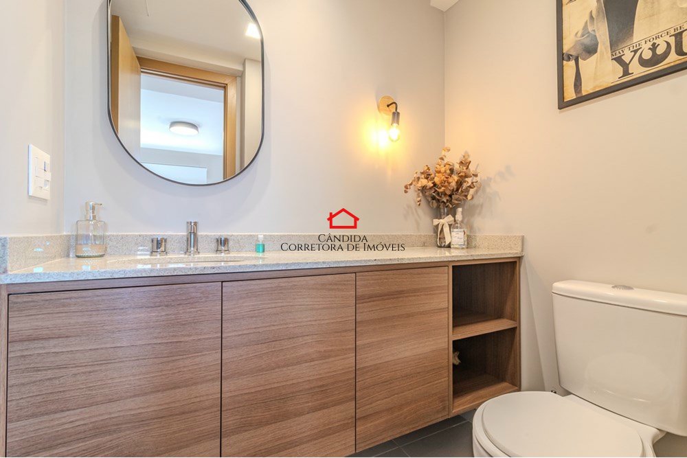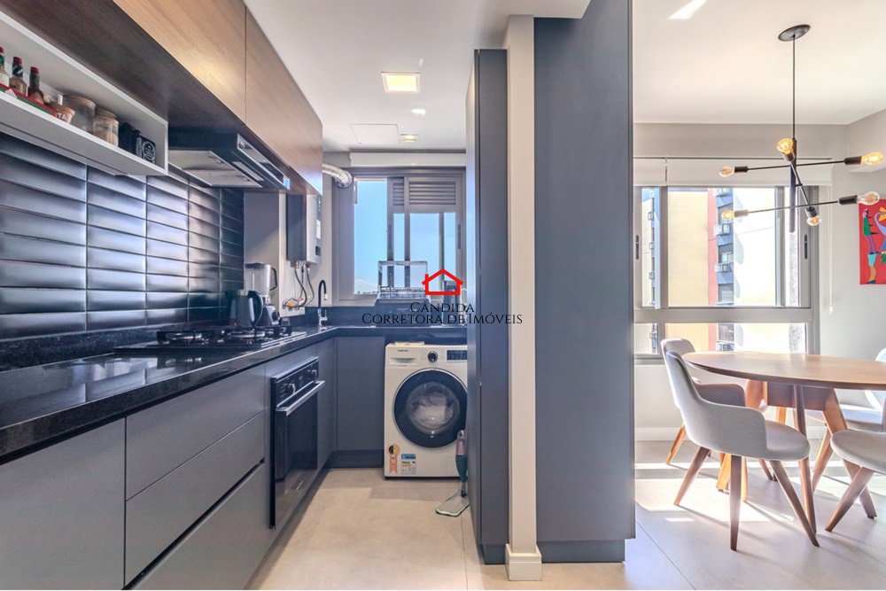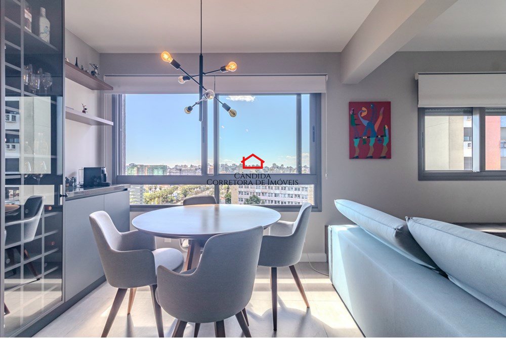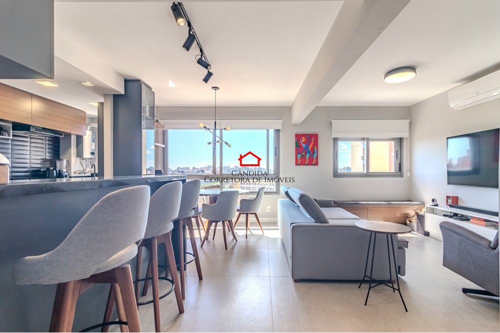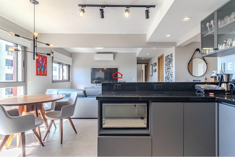 Este apartamento moderno de 75m² privativos foi originalmente de três dormitórios e hoje oferece um amplo living estendido, criando um ambiente sofisticado e aconchegante. São dois dormitórios, sendo um suíte, além de banheiro social.