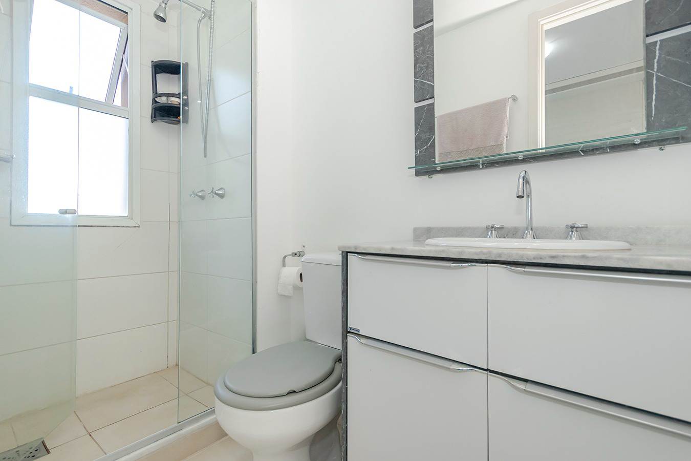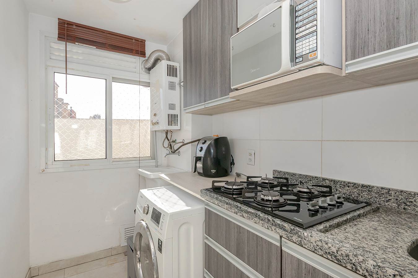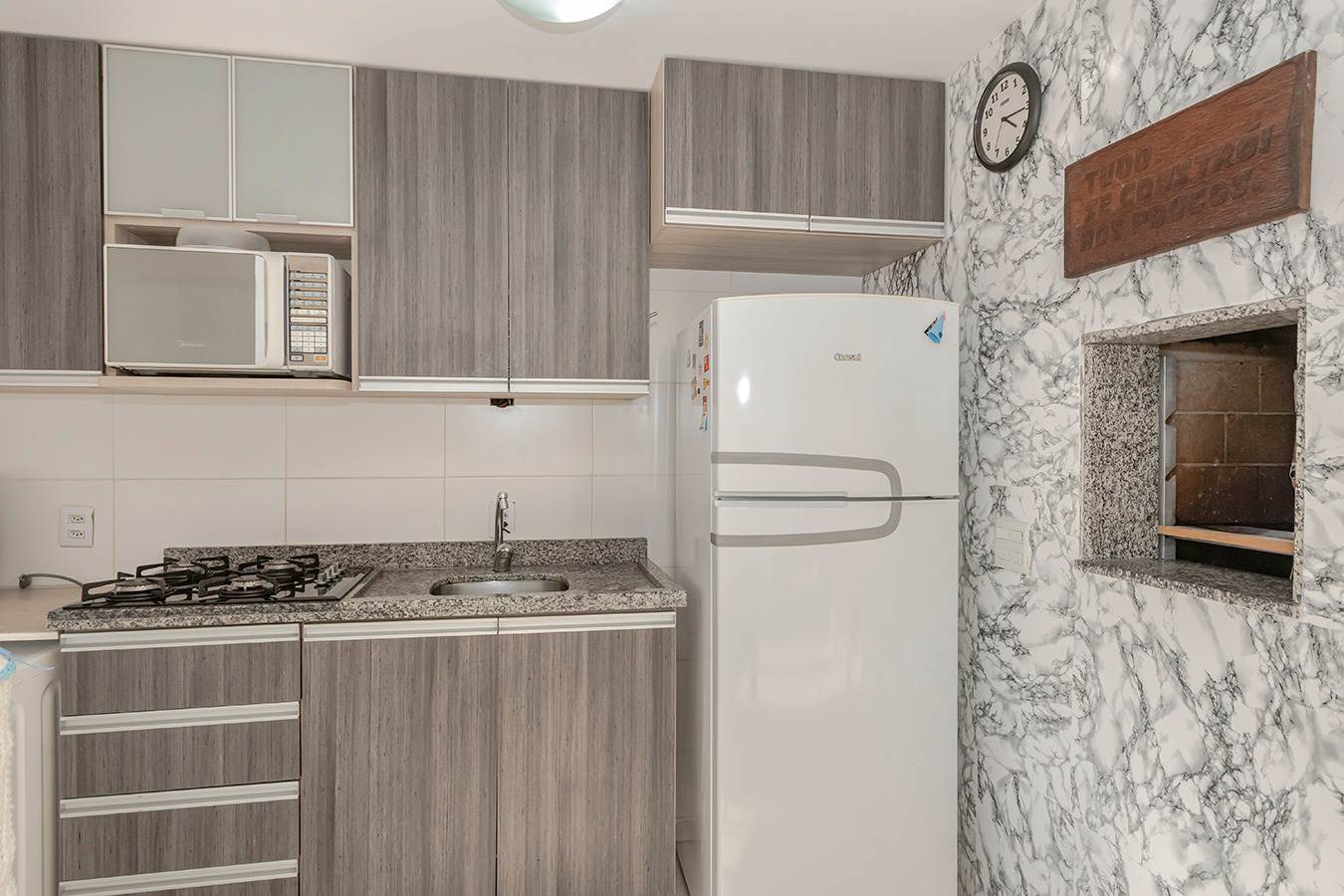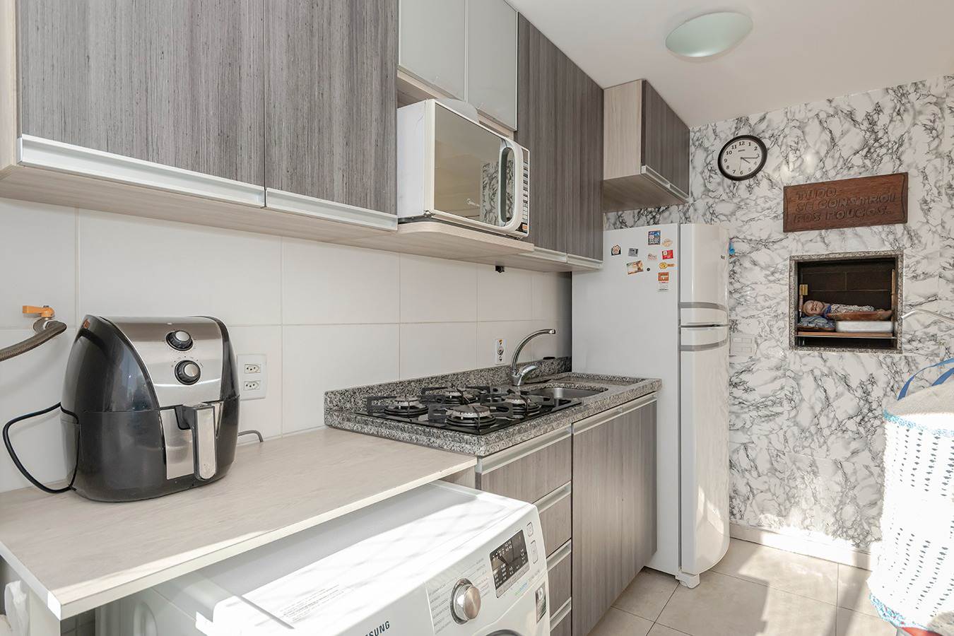 A cozinha, funcional e bem distribuída, possui móveis sob medida, oferecendo praticidade e excelente aproveitamento de espaço. Além disso, o apartamento conta com churrasqueira privativa, ideal para momentos especiais e confraternizações.