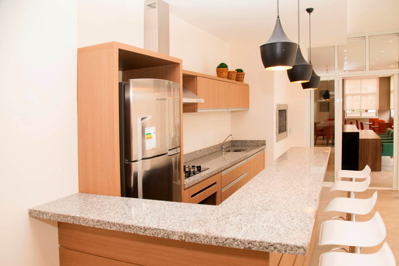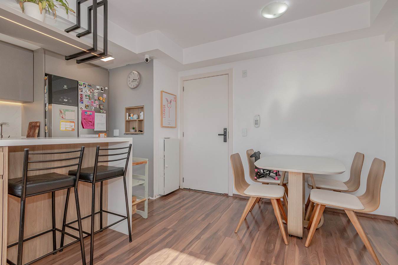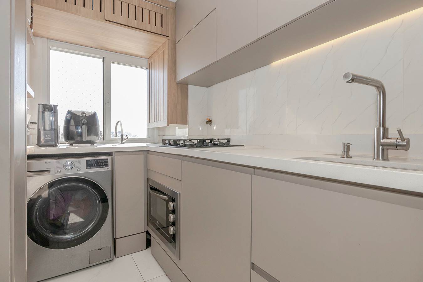 A cozinha foi reformada com elegante bancada em quartzo sintético e equipada com eletrodomésticos de alto padrão. O espaço gourmet conta com churrasqueira interna, cristaleira e cervejeira Electrolux 96L cervejeira, perfeito para receber amigos com estilo.