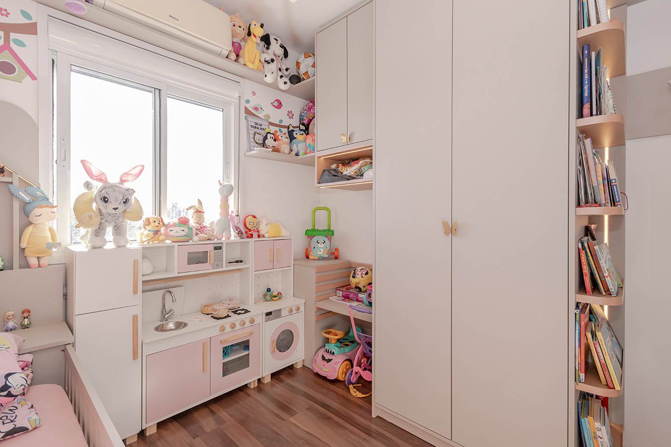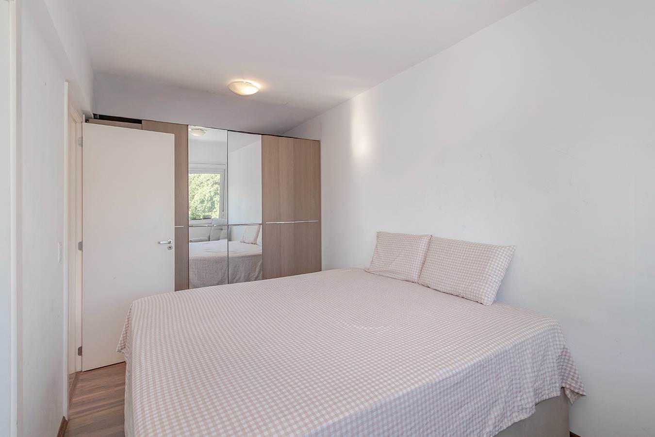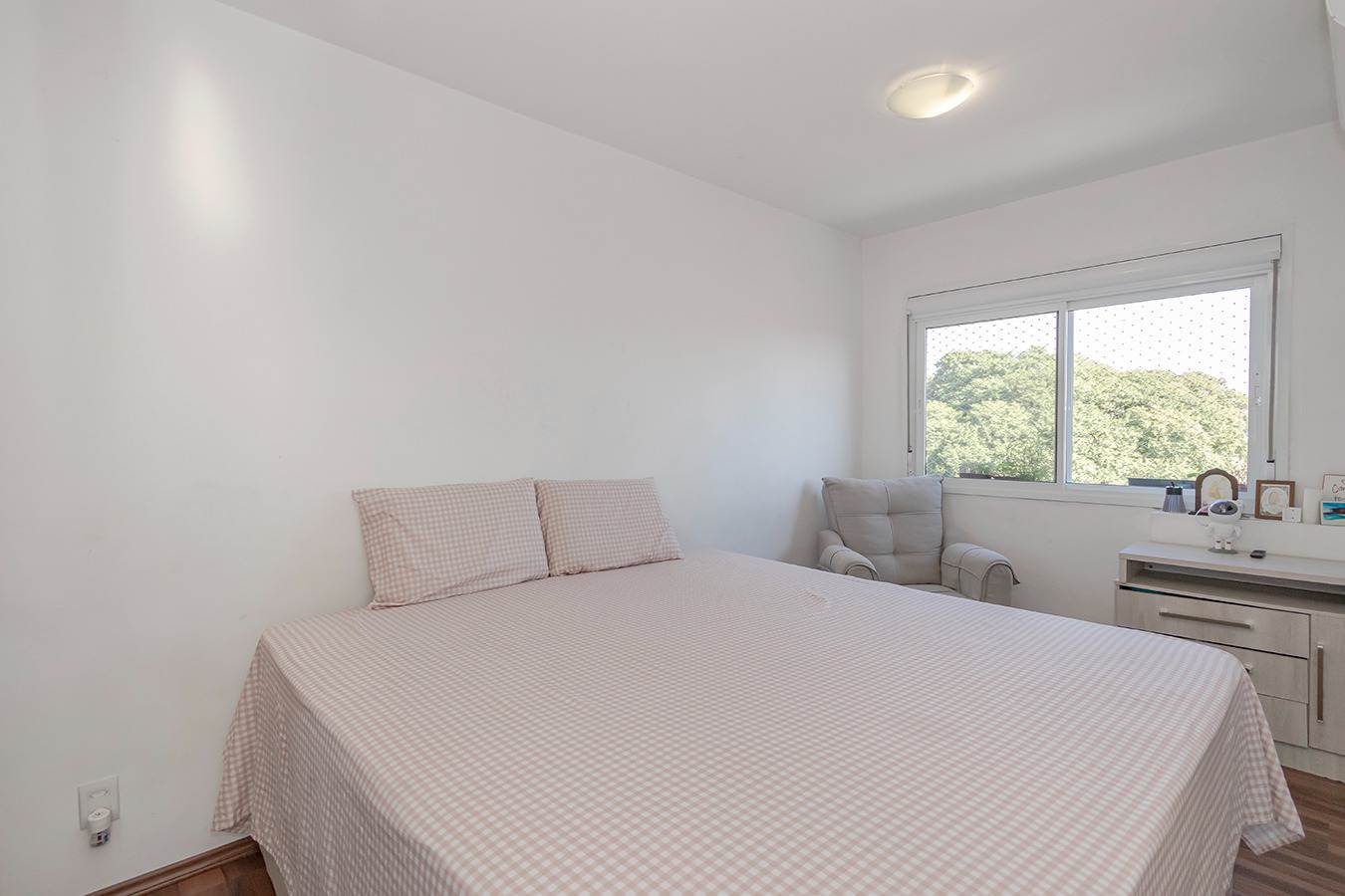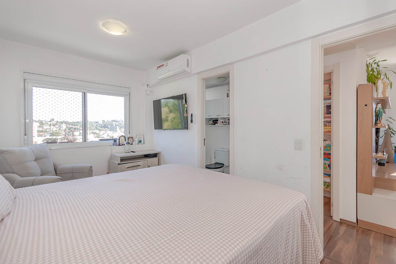 A suíte dispõe de cama baú king-size, armários planejados e TV 50”, enquanto o segundo dormitório conta com cama auxiliar, armário, mesa de estudos e TV — ideal para família ou visitas.