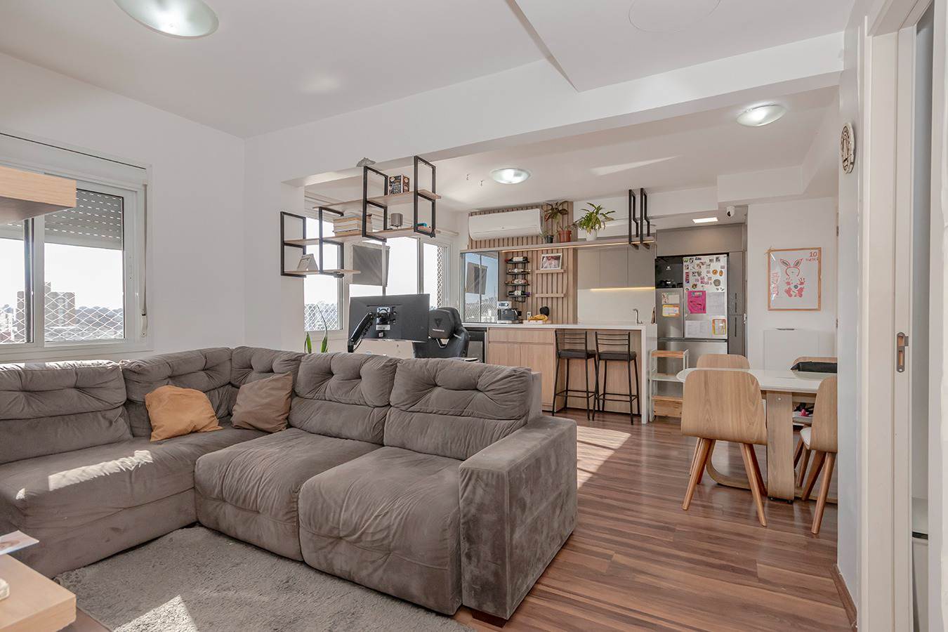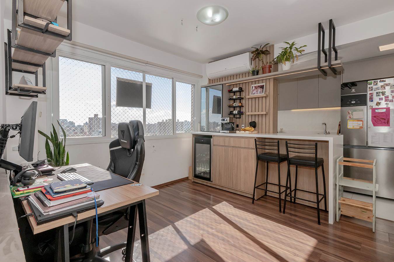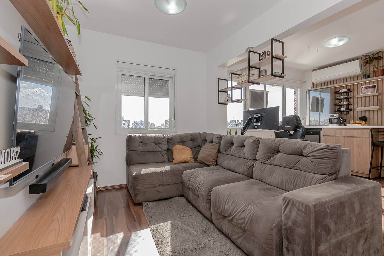 A sala oferece sofá-cama de alto padrão, TV OLED 55” com soundbar e um elegante painel com biblioteca. O home office é totalmente equipado com mesa, cadeira ergonômica e monitor de 29”.