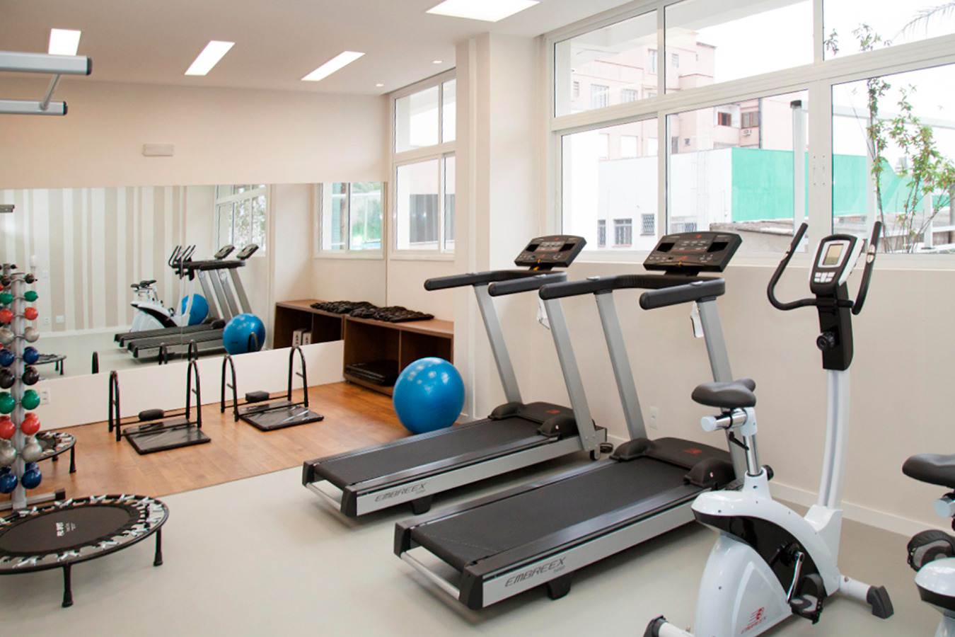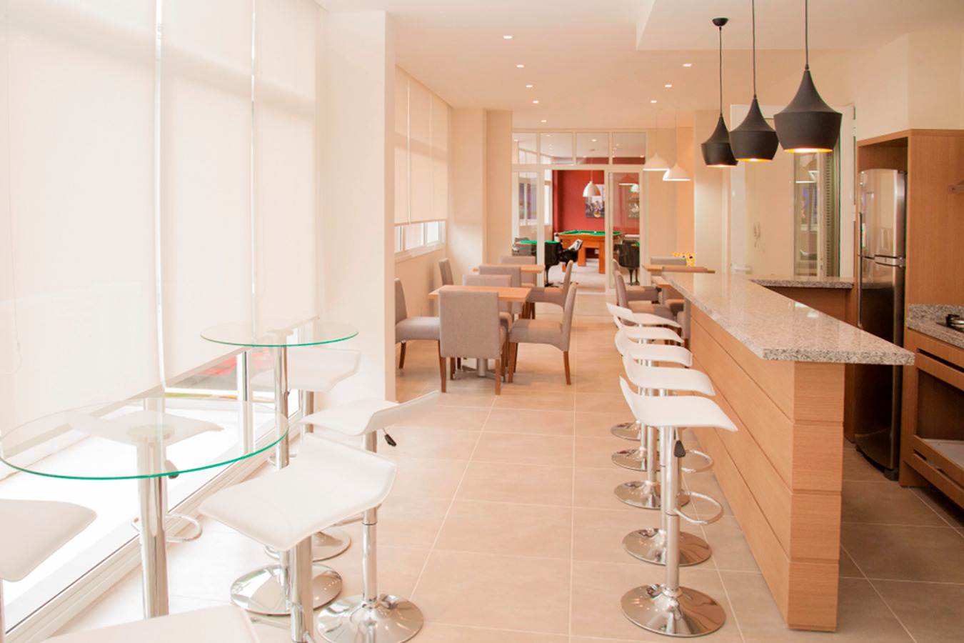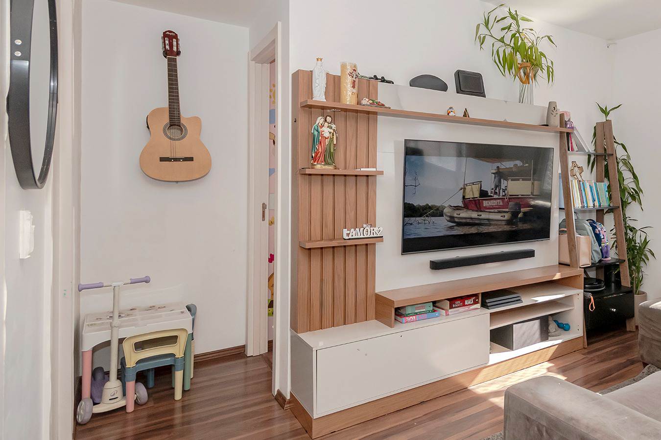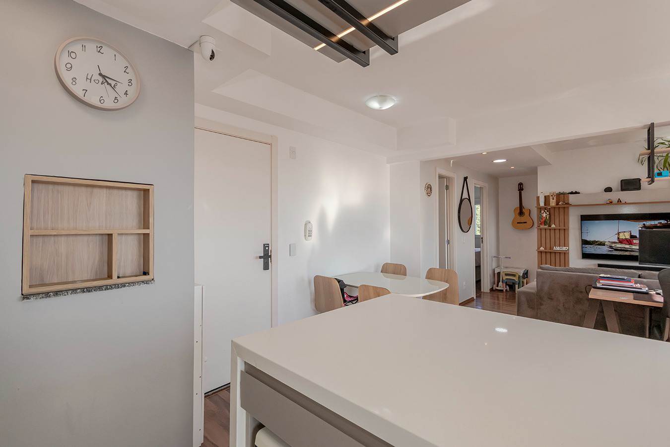 A sala oferece sofá-cama de alto padrão, TV OLED 55” com soundbar e um elegante painel com biblioteca. O home office é totalmente equipado com mesa, cadeira ergonômica e monitor de 29”.