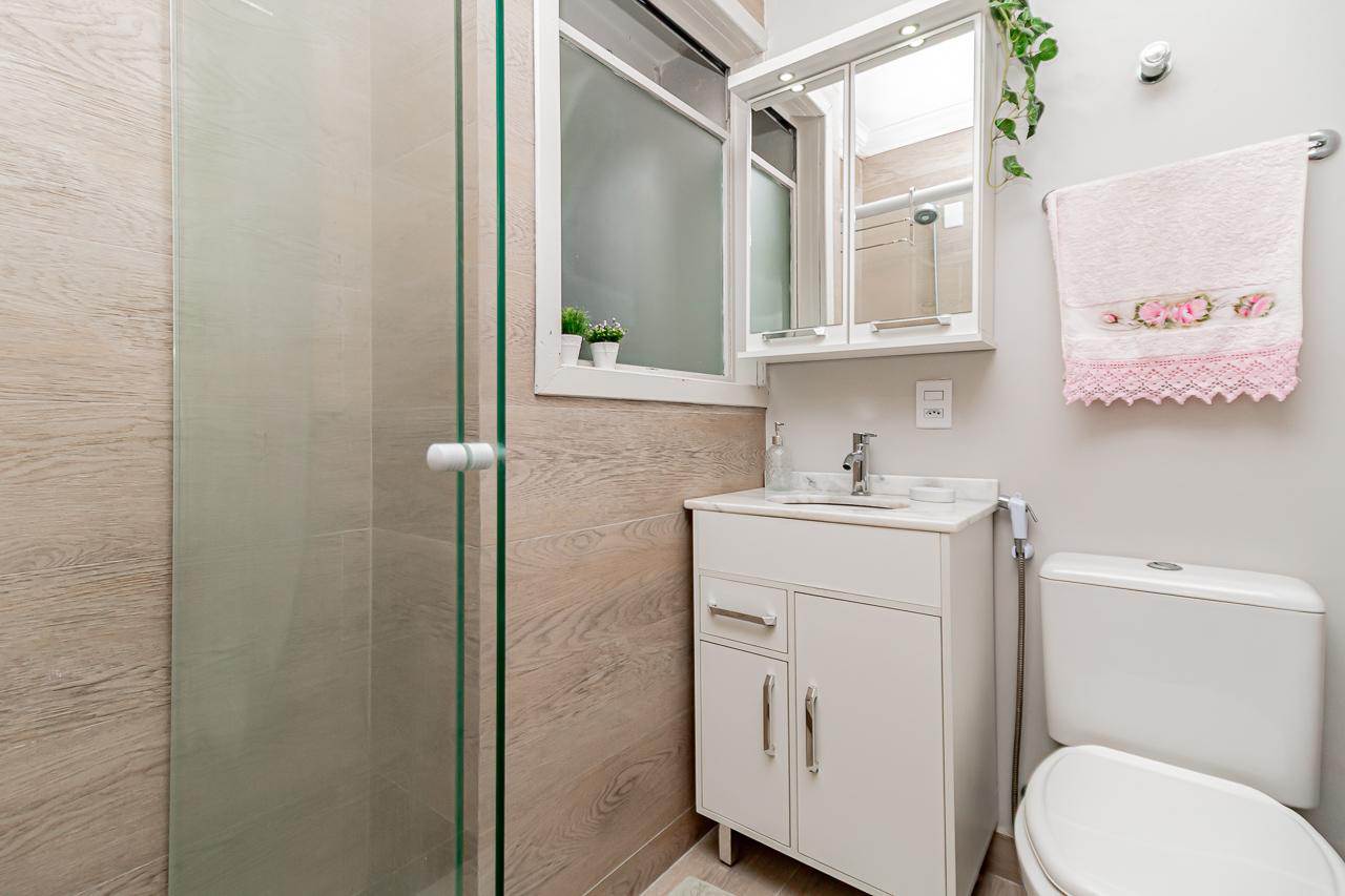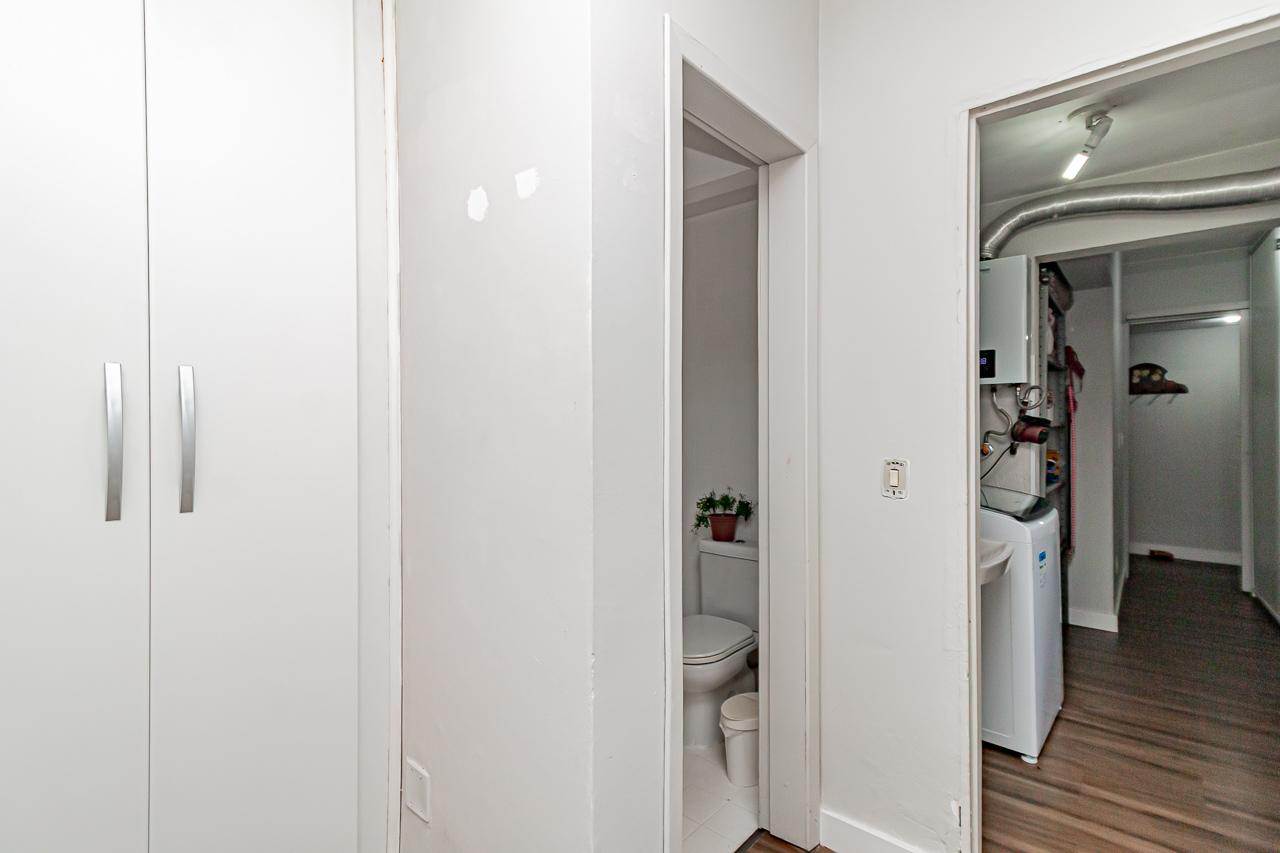 Apartamento com 3 dormitorios, banheiro social, área de serviço com armários, banheiro auxiliar, sala.