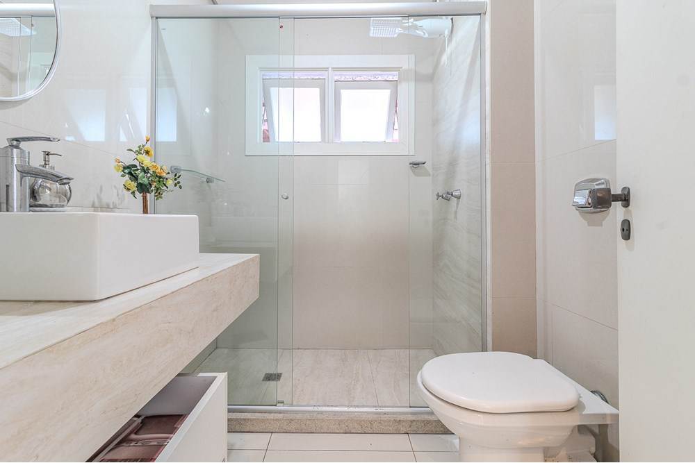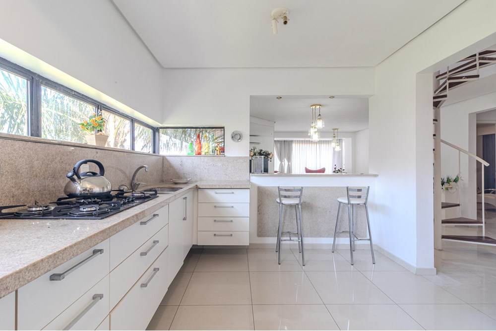 No pavimento inferior, o living para três ambientes integra-se à cozinha americana planejada em conceito aberto, criando um espaço social fluido e funcional para o dia a dia e para receber convidados. O ambiente conta ainda com lavabo e sistema de gás central, agregando praticidade e conforto. A área íntima dispõe de dois dormitórios bem iluminados e ventilados, atendidos por banheiro social, proporcionando organização e bem-estar na rotina dos moradores.